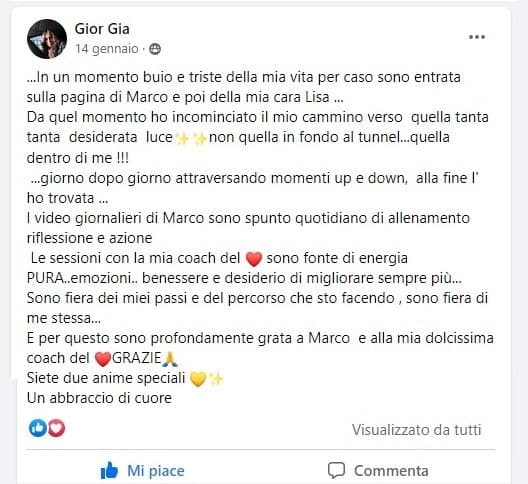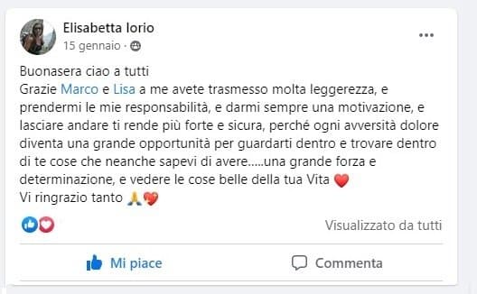 Ci aspetta ancora una grande bella avventura e io non smetterò mai di lasciare quella mano che Marco mi ha teso. Ogni giorno farò tesoro del suo aiuto, della sua positività, allegria e gioia di vita che è stato proprio lui a restituirmi.